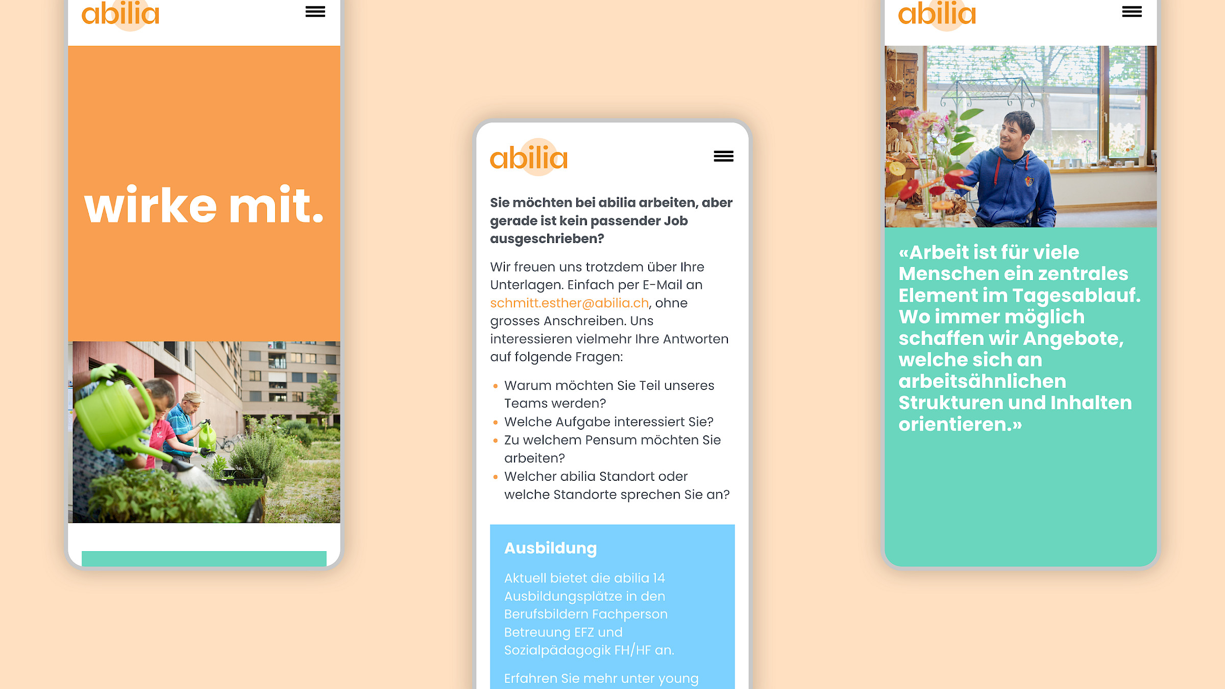 Wir haben für abilia einen neuen Auftritt konzipiert mit neuem Logo und einer neuen Website. Ein farbenfrohes und übersichtliches Design trifft auf eine leicht verständliche Sprache. Ebenso haben wir die Institution dabei begleitet. ihren Purpose zu formulieren, aus dem schliesslich auch der Claim «wirke mit.» entstanden ist.