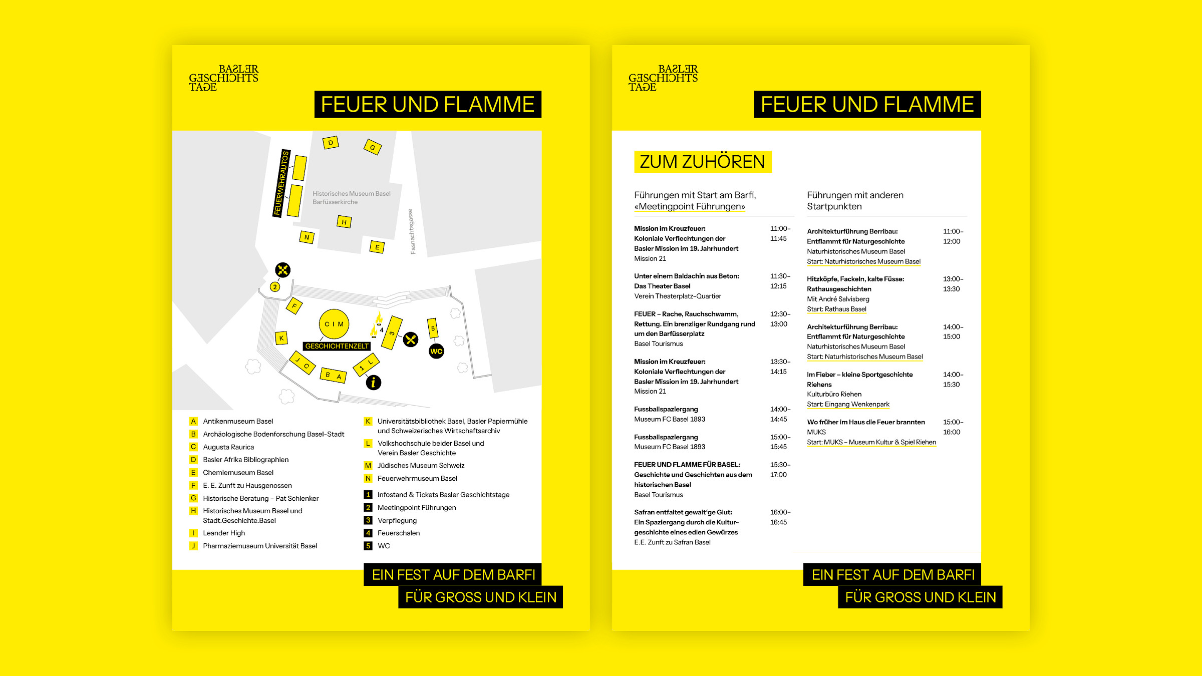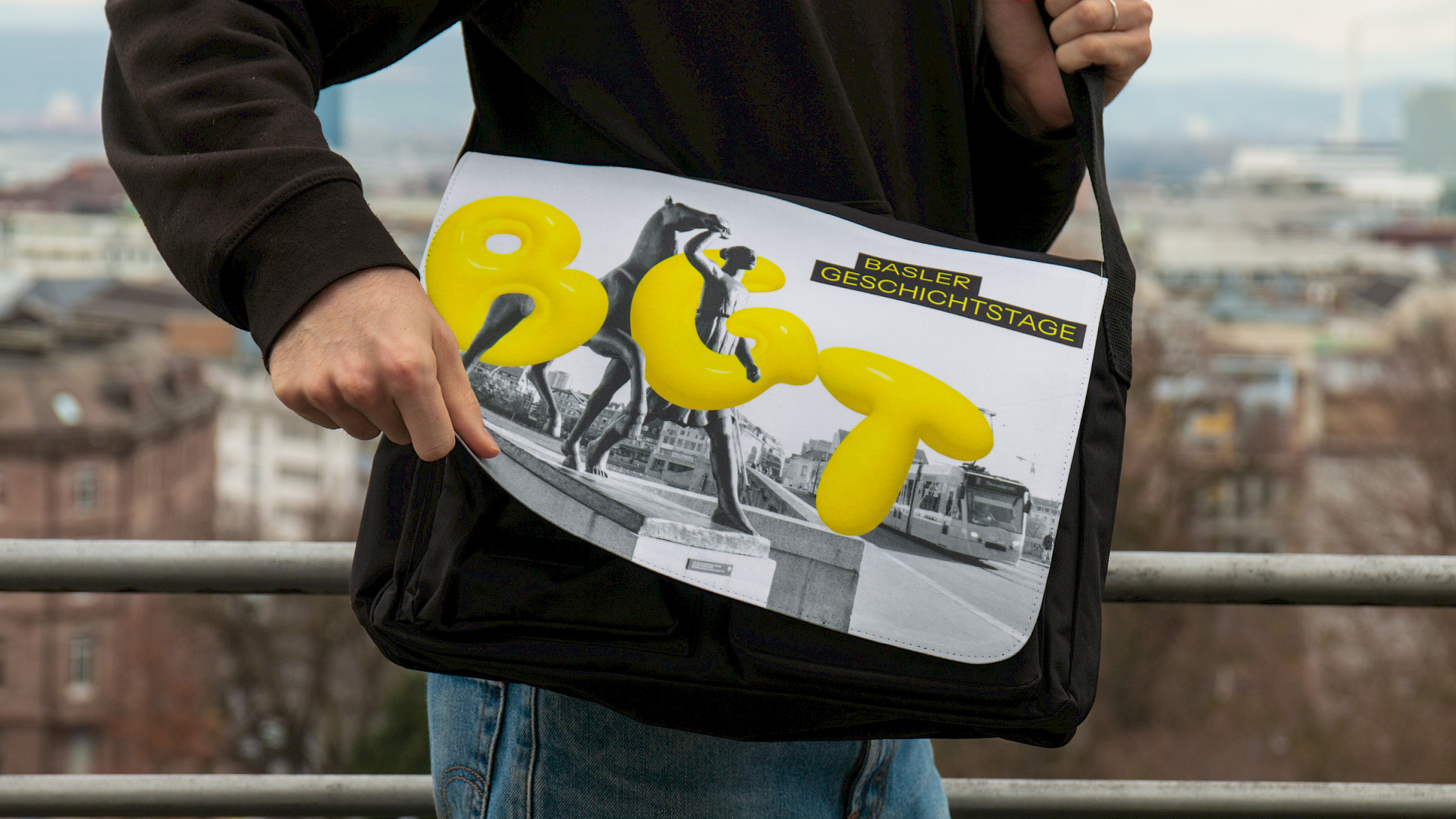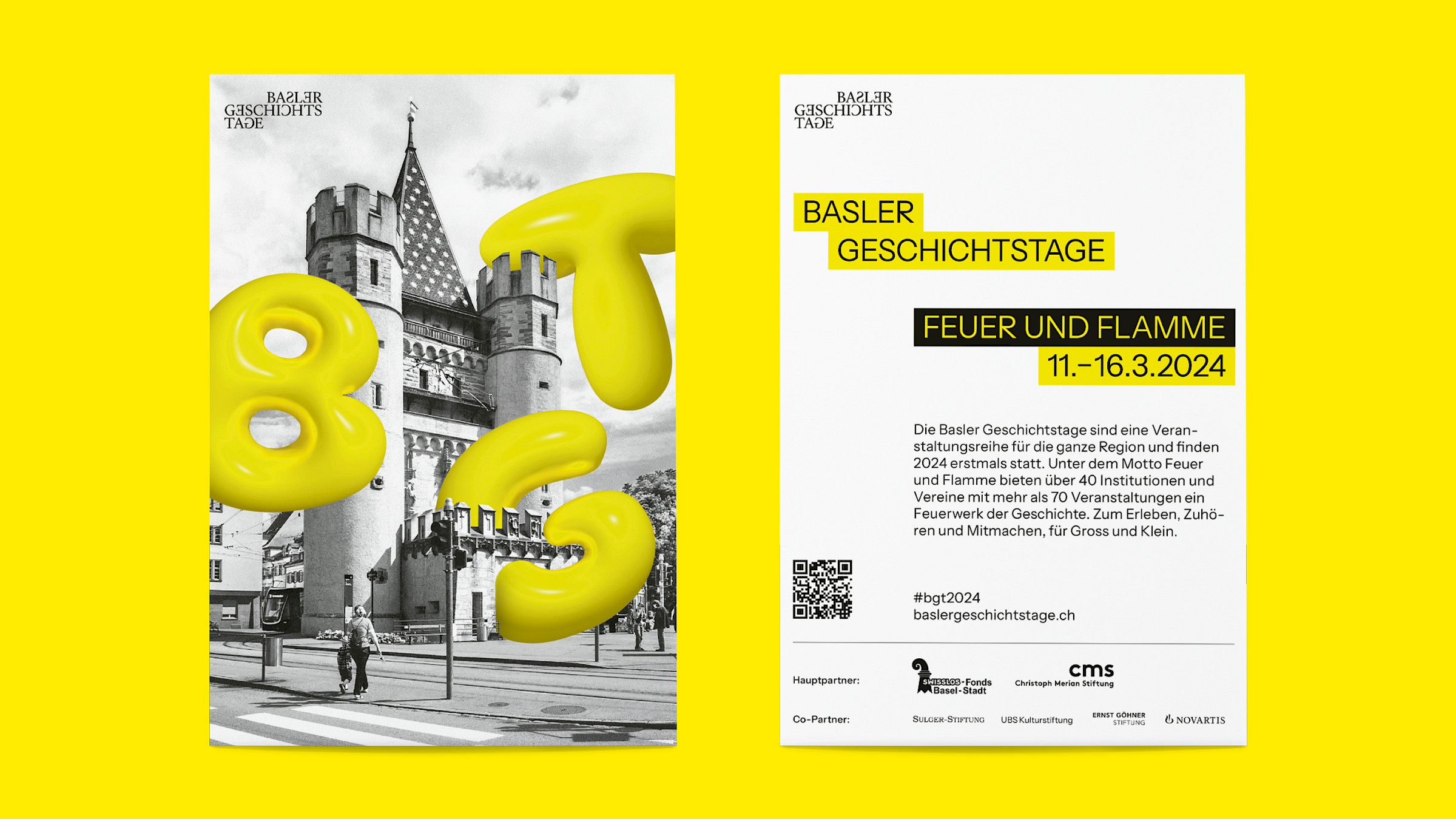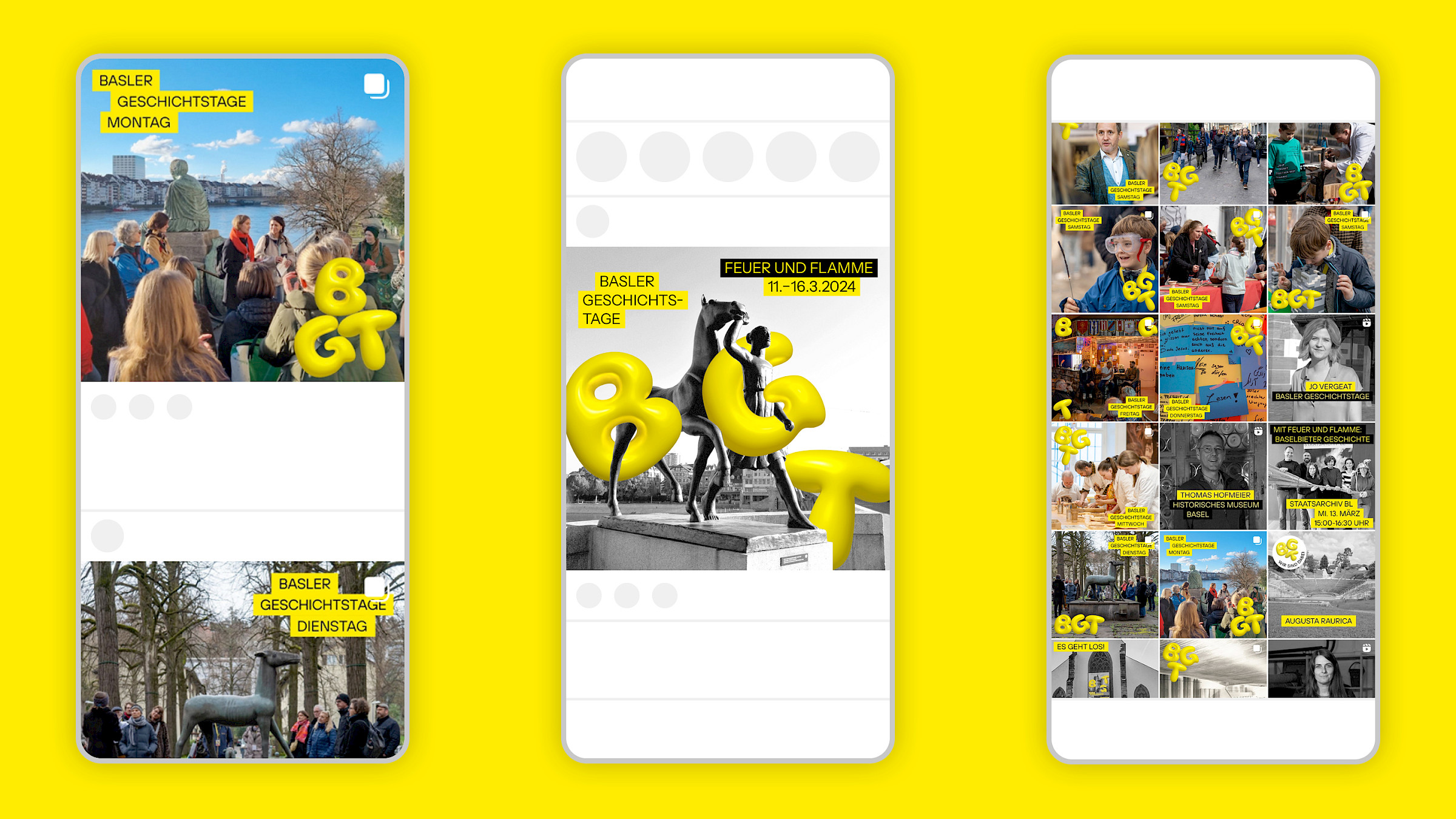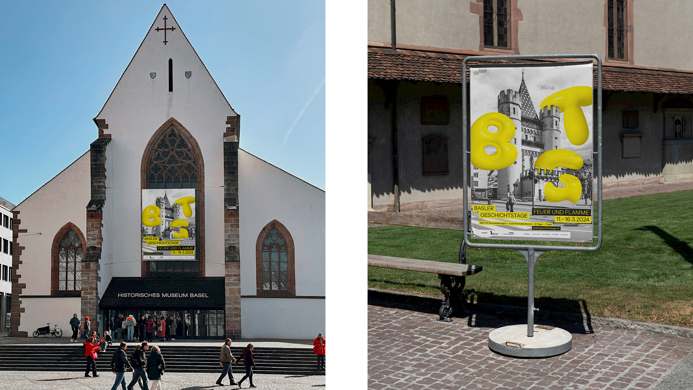 Mit riesengrossen, gelb leuchtenden Buchstaben «BGT», die zwischen historischen Gebäuden und Denkmälern der Stadt schweben, wurden die Geschichtstage auf Plakaten, Flyern, Social Media und auf der Webseite baslergeschichtstage.ch beworben. Sogar an der Fassade des Historischen Museums war das Visual während der Veranstaltungswoche zu sehen – an dem Ort, wo am Samstag das grosse Abschlussfest mit zahlreichen Besucherinnen und Besuchern, Speis und Trank und diversen Mitmach-Aktionen stattfand.