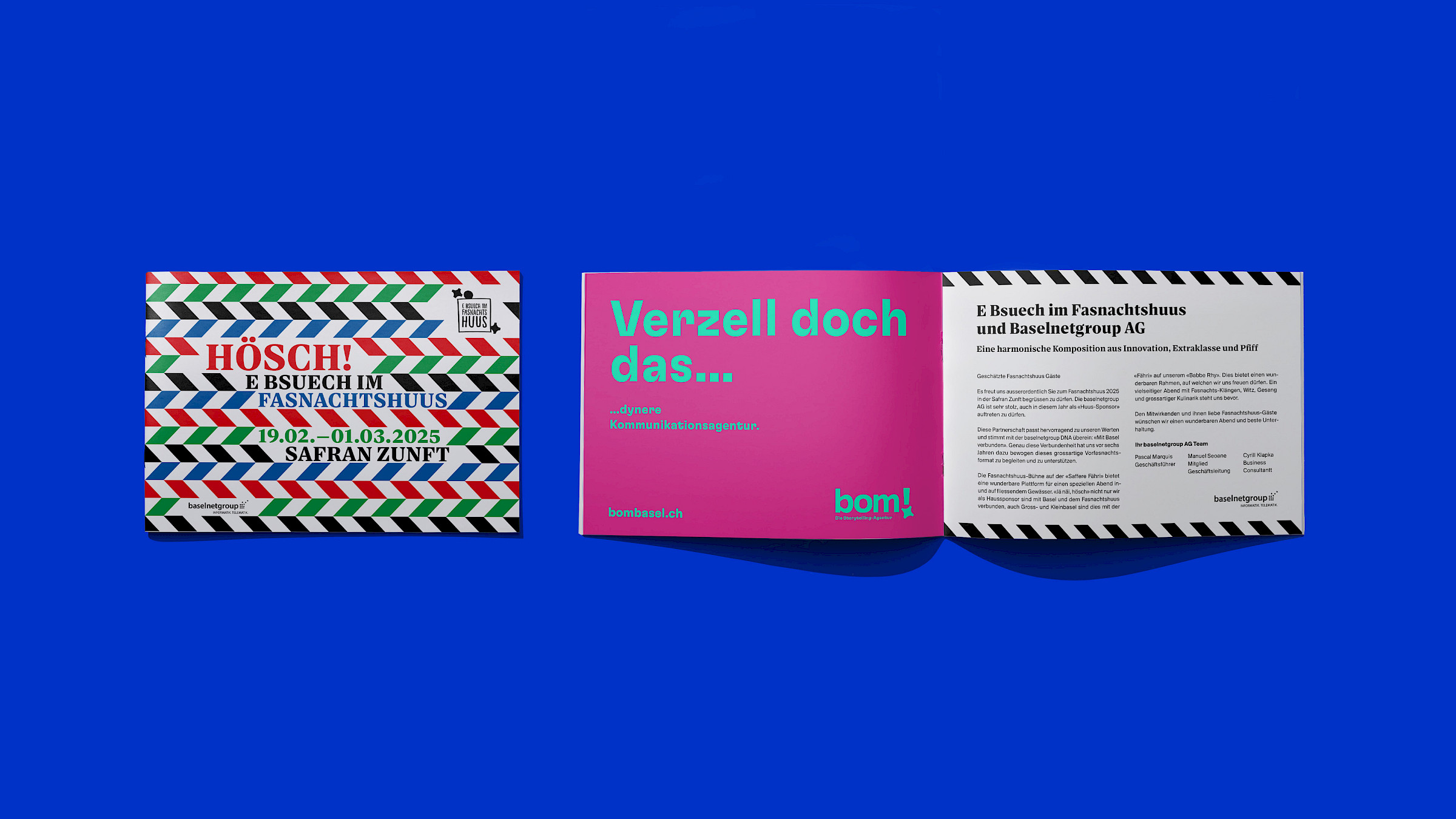 Jedes Jahr im Januar findet die Vorfasnachtsveranstaltung «E Bsuech im Fasnachtshuus» statt. Als Hauptsponsor unterstützen wir das Fasnachtshuus mit der gesamten Gestaltung – vom Key Visual bis zur Umsetzung.