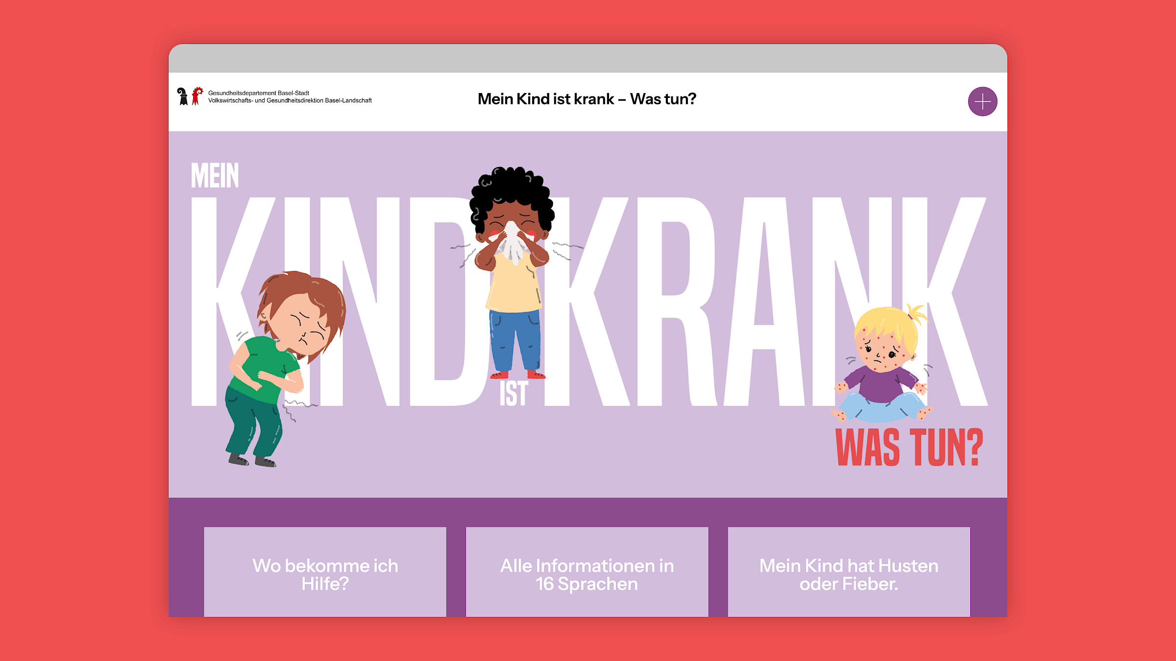 In vergangenen Jahren kam es auf der Notfallstation des Universitäts-Kinderspitals beider Basel und in vielen Kinderarztpraxen zu Überlastungssituationen. Um diesem Problem entgegenzuwirken, lancierten die Kantone Basel-Stadt und Basel-Landschaft 2023 die Informationskampagne «Mein Kind ist krank – was tun?». Ziel der Informationskampagne ist es, die Eltern dabei zu unterstützen, die richtige Entscheidung für ihr krankes Kind zu treffen und die angemessene Anlaufstelle zu wählen. Damit soll die Gesundheitskompetenz der Eltern gefördert und das Gesundheitssystem entlastet werden.