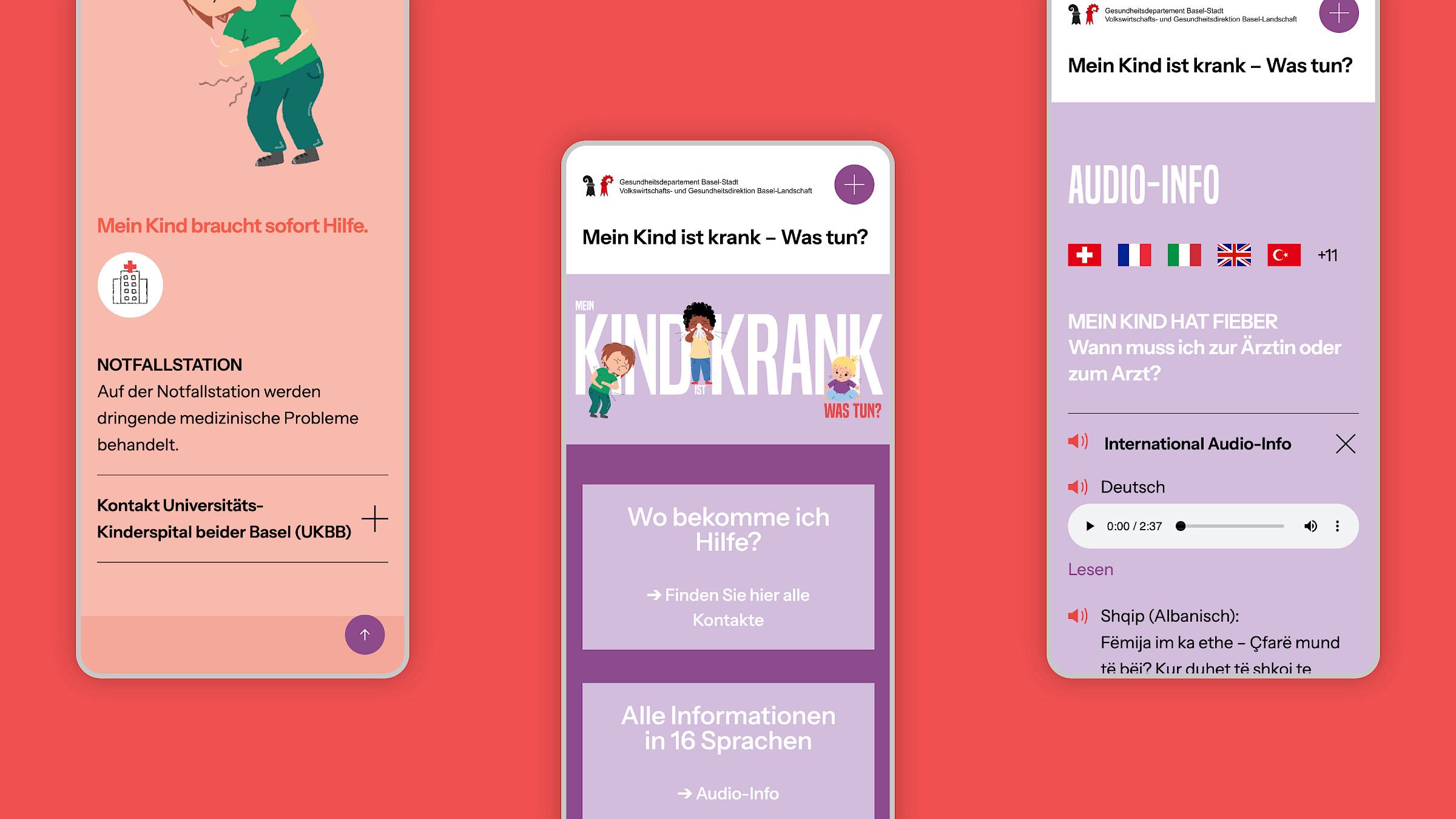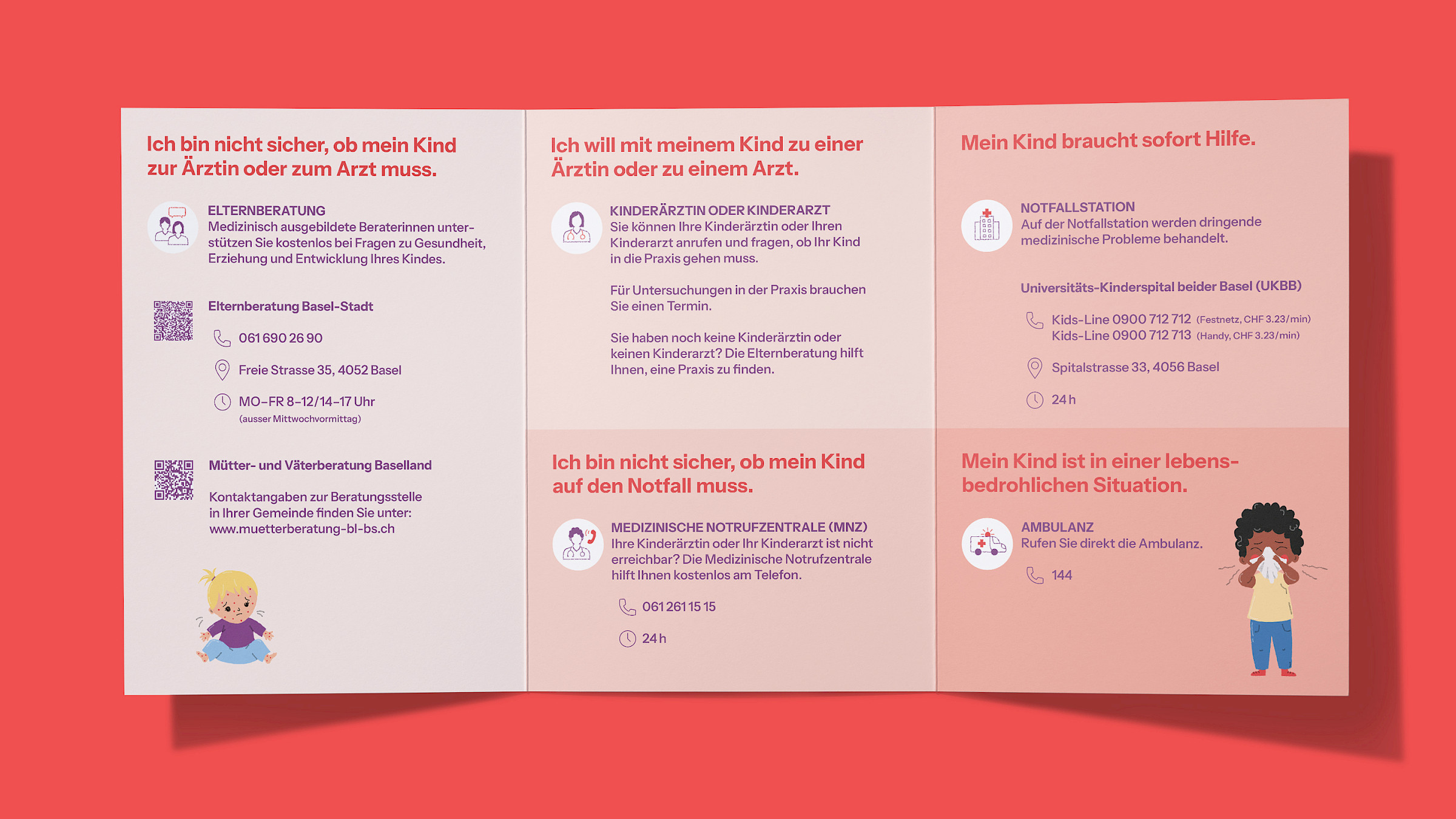 Die Kampagne umfasst einen Flyer, eine Webseite, Social Media-Posts und drei verschiedene Audio-Dateien in je 16 Sprachen. Die Kampagne bietet damit auch fremdsprachigen Eltern eine einfache Übersicht über die verschiedenen Krankheitssituationen und ermöglicht ihnen, schnell die richtige Anlaufstelle zu finden. Besonders die Elternberatung und die Medizinische Notrufzentrale, die bis anhin zu wenig bekannt waren, wurden in den Vordergrund gerückt mit dem Ziel, die Kinderarztpraxen und die Notfallstation im UKBB zu entlasten.