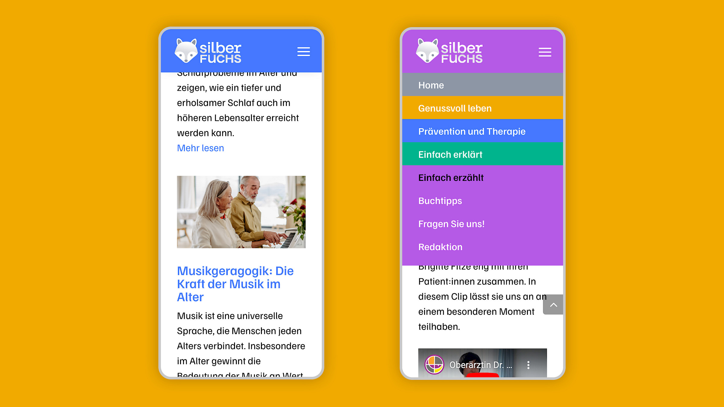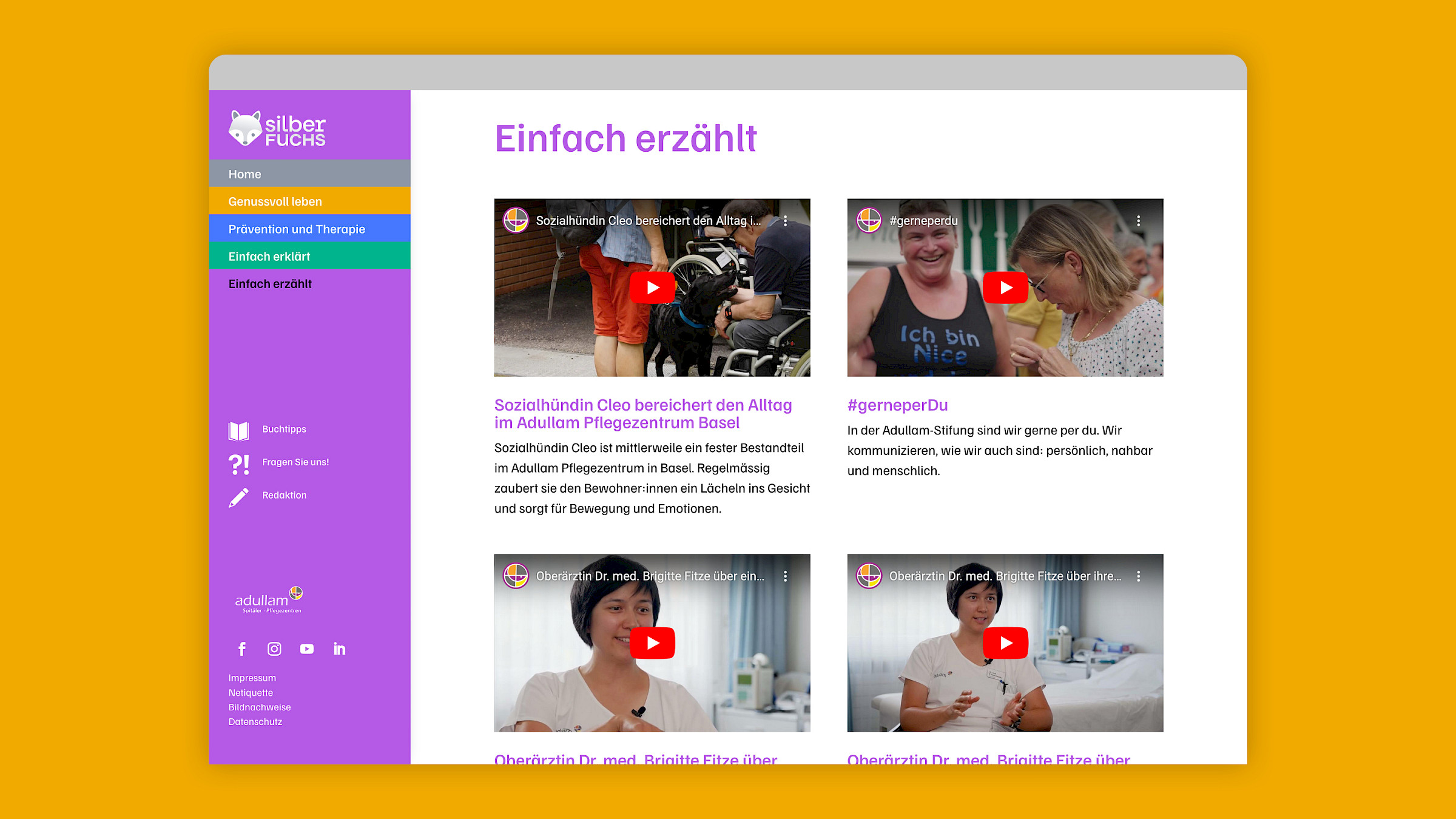 Das 2023 lancierte Online-Magazin der Adullam-Stifung ist Plattform, Nachschlagewerk und Kommunikationsinstrument in einem. Silberfuchs richtet sich an ein breites Publikum aus Seniorinnen und Senioren, Fachleuten und Angehörigen, behandelt alle Fragen rund um die Gesundheit im Alter und verzichtet dabei bewusst auf den Medizinjargon. «Blasenschwäche?» Silberfuchs gibt «Tipps und Tricks für ein sorgenfreies Leben!». Das Magazin erklärt auch, warum eine Grippeimpfung im Alter sinnvoll ist oder wie man sich ausgewogen ernährt. Fundierte medizinische Fakten werden frisch und unterhaltsam publiziert.
