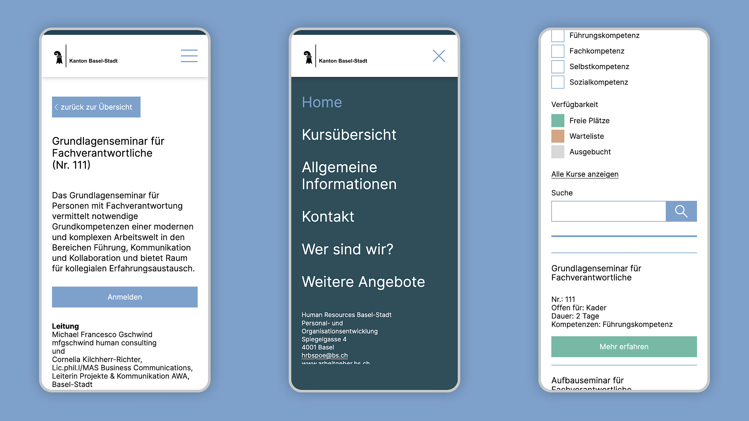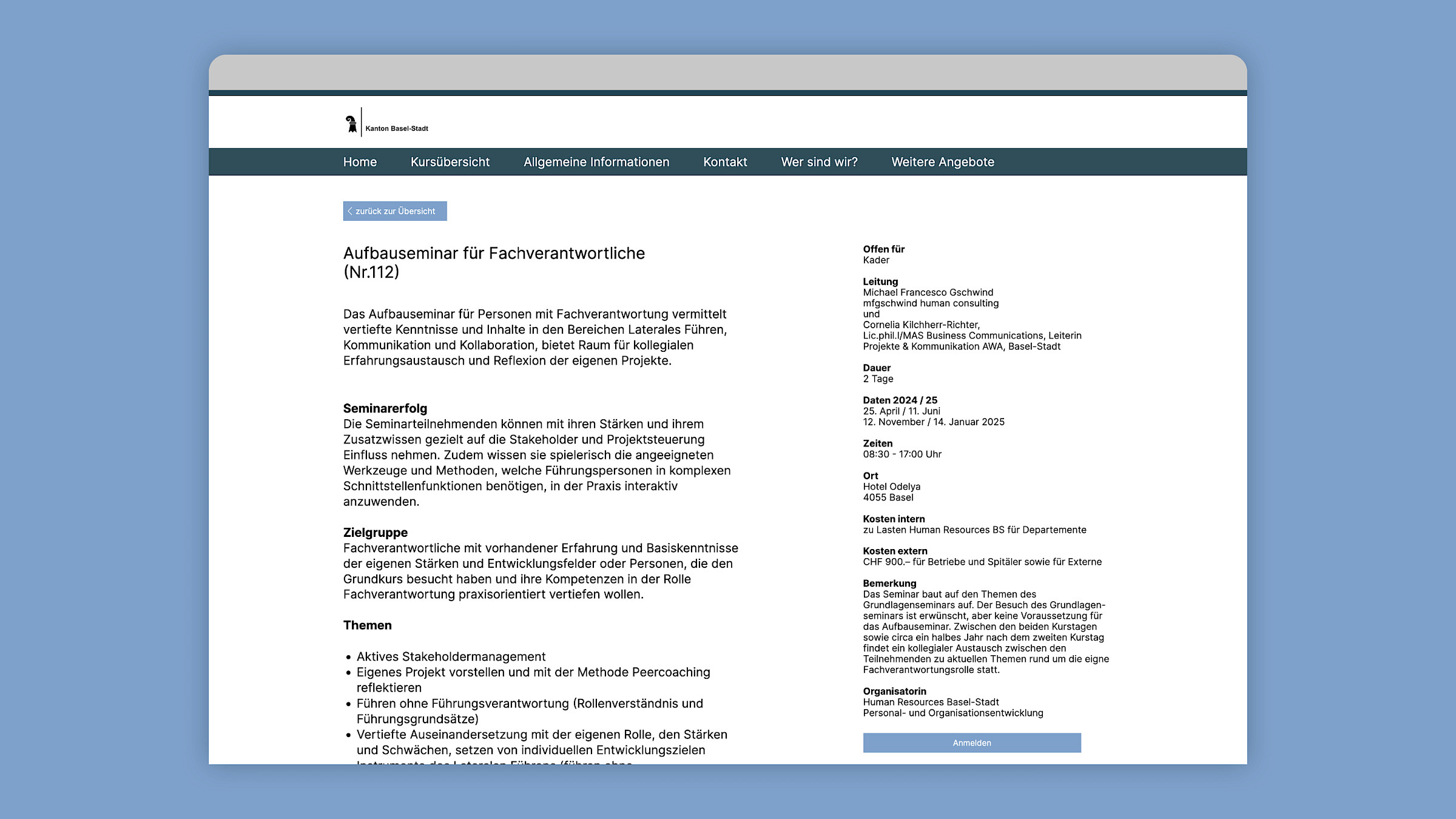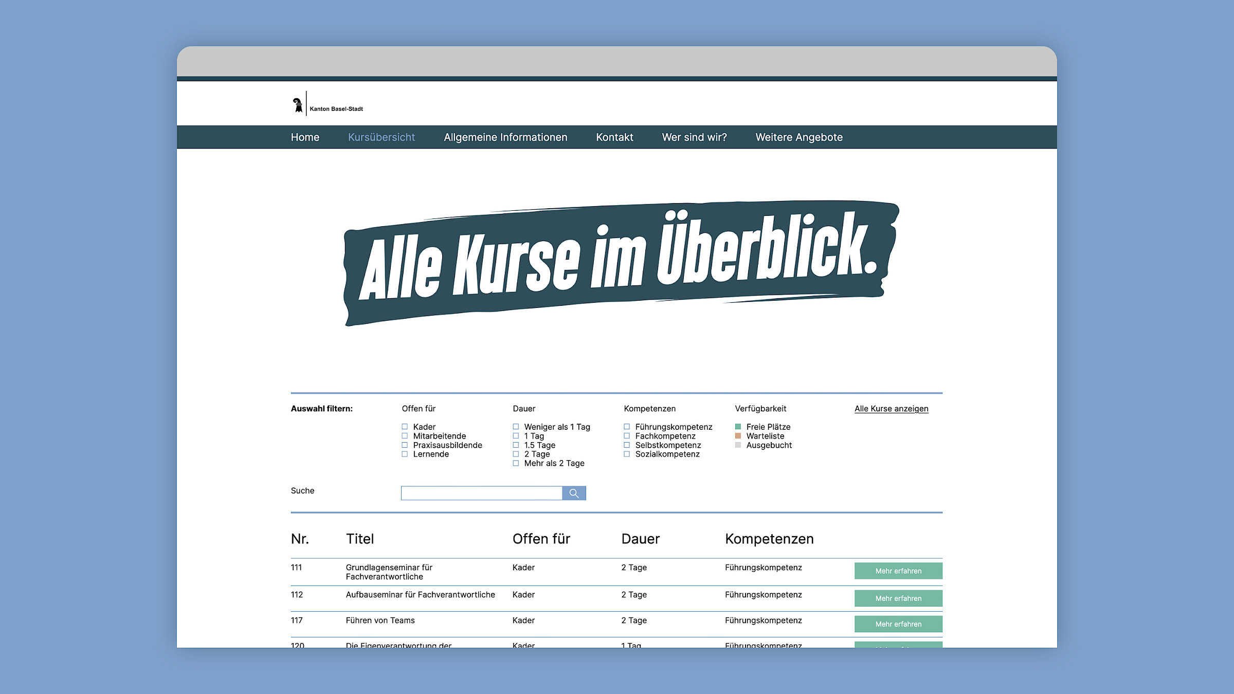 Im Auftrag der Human Resources Basel-Stadt haben wir das Weiterbildungsportal neu konzipiert, gestaltet und umgesetzt. Es listet einfach verständlich und niederschwellig alle Weiterbildungsangebote des Kantons Basel-Stadt für verwaltungsinterne und -externe Mitarbeitende auf. Die Suche ist intuitiv mit Filterfunktionen konzipiert, so dass die Benützung auch mit komplexen Suchkriterien gelingt.